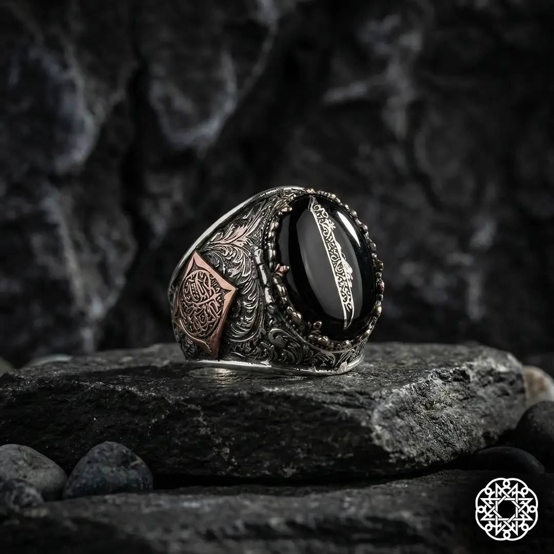 Kapaklı olarak tasarlanan modelin üst yüzeyinde, siyah yeni nesil kehribar üzerine işlenen Elif harfi yer alır. Siyah kehribarın asaleti ve Elif’in sadeliği, tasarıma güçlü bir estetik denge kazandırır. Kapaklı yapı, yüzüğe hem gizemli hem de özel bir karakter katar.