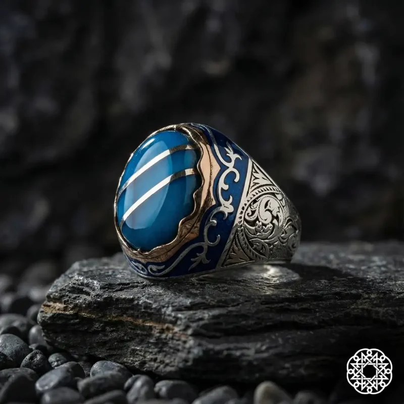 Mavi Yarma Galalit Gümüş Erkek Yüzük Modeli; detaylarda boğulmak istemeyen, gücünü sessizlikle ifade eden erkekler için tasarlanmıştır. Doğal taşın karakterini ve gümüşün sağlamlığını bir arada taşıyan bu model, sade ama net bir duruş arayanlar için ideal bir tercihtir.
