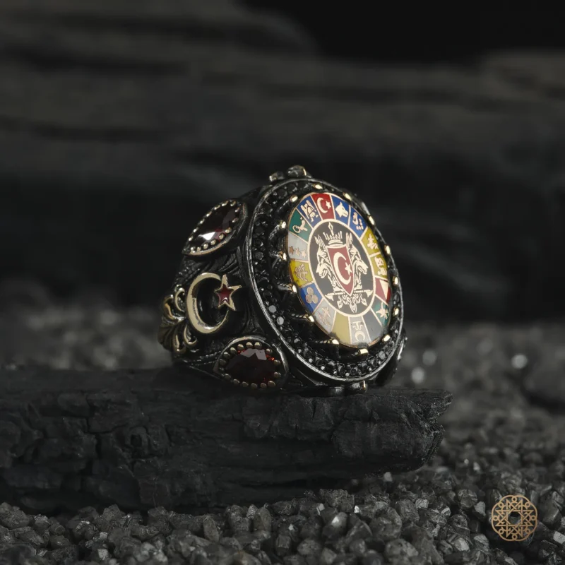 Gümüşten imal edilen modelimizin ön yüzünde, detaylı işçilikle hazırlanmış Türk Devletleri Teşkilatı simgesi yer almaktadır. Bu sembol; Türk devletleri arasındaki birlik, dayanışma ve ortak gelecek idealini temsil eder. Yüksek kabartma ve net çizgilerle işlenen bu motif, yüzüğe güçlü ve kararlı bir karakter kazandırır.
