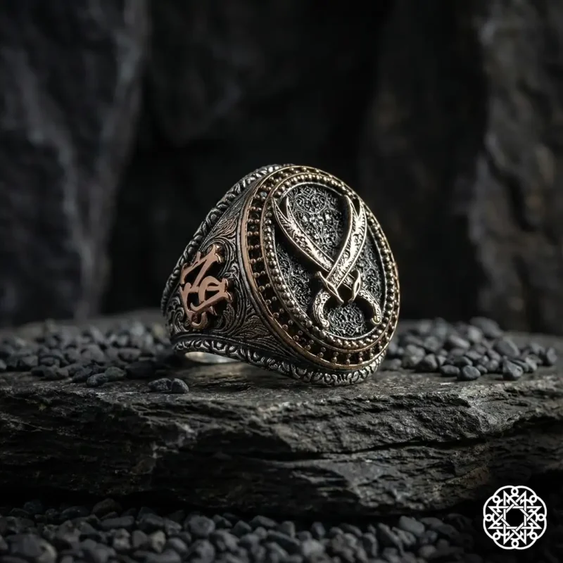 Zülfikar motifinin sağ ve solunda yer alan kişiye özel baş harfleri, lazer veya gravür tekniğiyle net ve kalıcı biçimde işlenir. Bu detay, yüzüğü tamamen size ait kılar. Harfler, kimliği sembolleştirir; yüzüğe güçlü bir aidiyet duygusu kazandırır. Aynı zamanda anlamlı ve özel bir hediye alternatifi sunar.